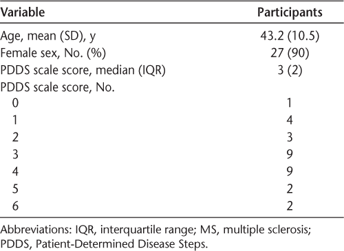Disability due to MS was measured using the PDDS scale, a valid surrogate for the Kurtzke Expanded Disability Status Scale (EDSS).17 The PDDS scale is a patient-reported outcome that focuses primarily on walking ability and asks the participant to select one of nine items (score, 0 to 8) that best describes his or her disability. Lower disability was defined as a PDDS scale score of 0 to 3 and higher disability as a PDDS scale score of 4 to 6.18,19 A score of 0 signifies mild symptoms and essentially normal function, whereas a score of 3 indicates symptoms from MS that affect daily activities, but walking is usually without an assistive device. A score of 4 means walking with a unilateral assistive device most or all of the time, and 6 indicates the need for bilateral assistance for walking short distances and occasional use of a wheelchair.