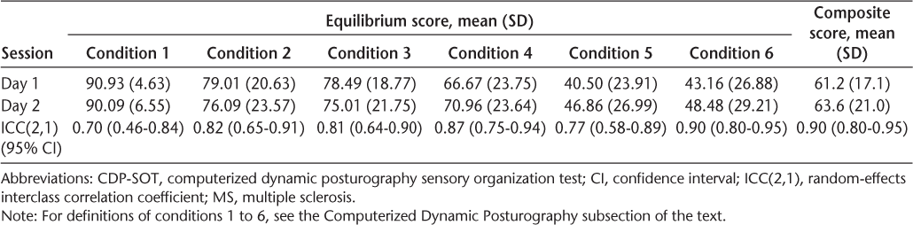 Descriptive statistics were used to characterize the participants. Test-retest reliability between the sessions was assessed using the two-way random-effects, single-measurement interclass correlation coefficient (ICC[2,1]); ICC values of 0.75 to 1.0 were considered excellent; 0.40 to 0.74, fair to good; and less than 0.40, poor.20 Two-sided independent t tests were used to evaluate differences between the lower- and higher-disability groups for the composite CDP-SOT scores as well as equilibrium scores for each condition. Discriminant validity was confirmed by statistically significant group differences using two-sided t tests (α = .05). All the analyses were performed using IBM SPSS Statistics for Windows, version 23.0 (IBM Corp, Armonk, NY).