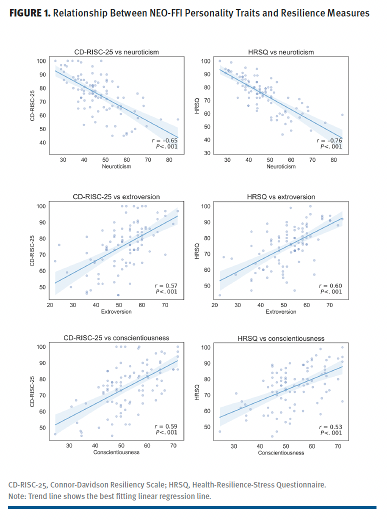 Table 2 provides an overview of the correlation between the 5 personality traits and caregiver resilience as measured by the CD-RISC-25 and the HRSQ. For the CD-RISC-25, higher levels of resilience were negatively correlated with neuroticism (r = –0.65; P < .001) and positively correlated with extroversion (r = 0.57; P < .001) and conscientiousness (r = 0.59; P < .001). However, no significant correlations were found between resilience and openness or agreeableness. Similarly, the HRSQ showed a strong negative correlation with neuroticism (r = –0.76; P < .001), positive correlations with extroversion (r = 0.60,; P < .001) and conscientiousness (r = 0.53; P < .001), and a weaker but still significant positive correlation with agreeableness (r = 0.24; P = .022). The significant correlations between the 2 resiliency measures and personality themes are depicted in Figure 1.