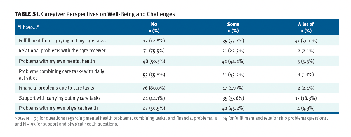 Table S1 shows how caregivers responded to questions regarding their well-being and the challenges they face. A substantial proportion of caregivers expressed high levels of fulfillment from their care tasks (n = 47; 50.0%), with the majority (n = 71; 75.5%) reporting no relational problems with the care receiver. Significant financial problems due to care tasks were reported by only a few caregivers (n = 2; 2.1%), whereas 17 (17.9%) reported some financial problems. Approximately half of the caregivers reported facing some challenges in their own mental (n = 47; 49.5%) or physical health (n = 46; 49.6%). Moreover, a considerable number of caregivers (n = 41; 44.1%) reported receiving no support from others in carrying out their MS care tasks.