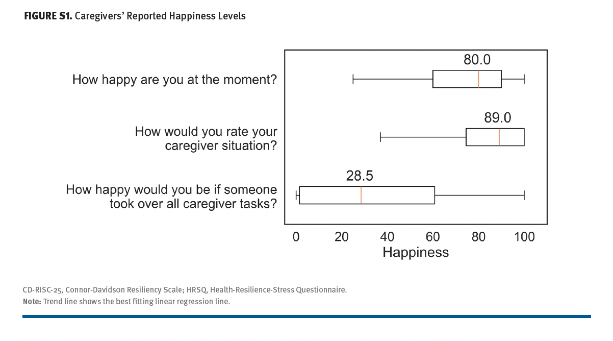 Furthermore, caregiver resiliency demonstrated a positive correlation with the overall happiness score measured by the happiness slider of the iVICQ (r = 0.51, P < .001 for CD-RISC-25; r = 0.56, P < .001 for the HRSQ). This suggests that higher levels of resiliency are associated with increased overall happiness among caregivers.