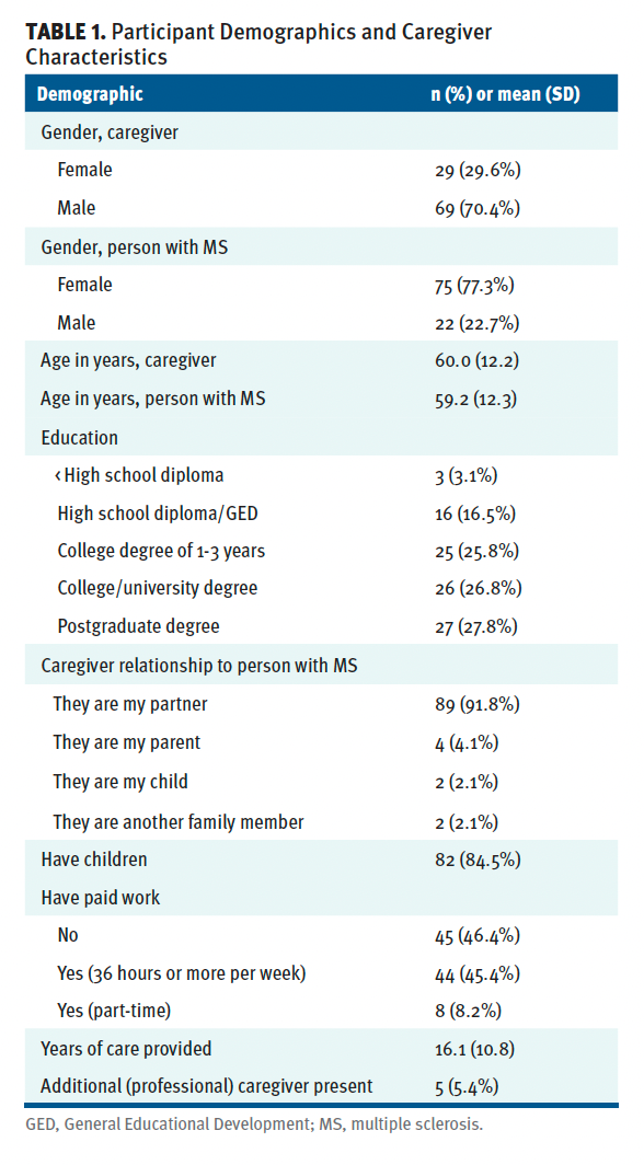 Of the 98 caregivers, 29 (29.6%) identified as women and 69 (70.4%) identified as men. Their average (SD) age was 60 years (12.2), similar to the average age of the patient with MS for whom the caregiver provided care, which was 59.2 years (12.3). The majority of caregivers (n = 89; 91.8%) indicated that they were a partner of the person with MS. The mean duration of caregiving was 16.1 years (10.8). A significant portion of caregivers (80.4%) held a college degree or higher level of education; 52 caregivers (53.6%) reported current employment in paid positions. Many caregivers fell into higher-income brackets, with 28.3% reporting an annual household income of $100,000 or greater, representing the highest proportion within the income ranges. See Table 1.
