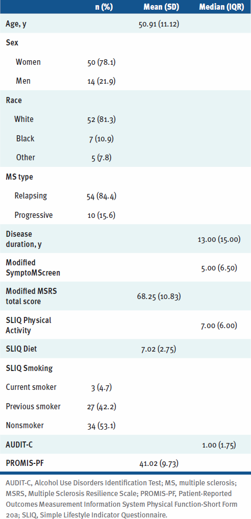 The importance of healthy lifestyle behaviors has been well documented in MS. Physical activity, for example, has been associated with higher health-related quality of life (HRQOL)11,12 and improved motor functioning.13 A healthy diet has also been positively associated with HRQOL.11 Conversely, unhealthy behaviors (eg, alcohol misuse and smoking) can have negative effects on MS-related disability.14 Resilient individuals with MS tend to engage in more healthy lifestyle behaviors (ie, more physical activity and healthier diet choices).15 The role of lifestyle behaviors was also recognized as a component of MS-related resilience in the development of the MS Resiliency Scale (MSRS).16