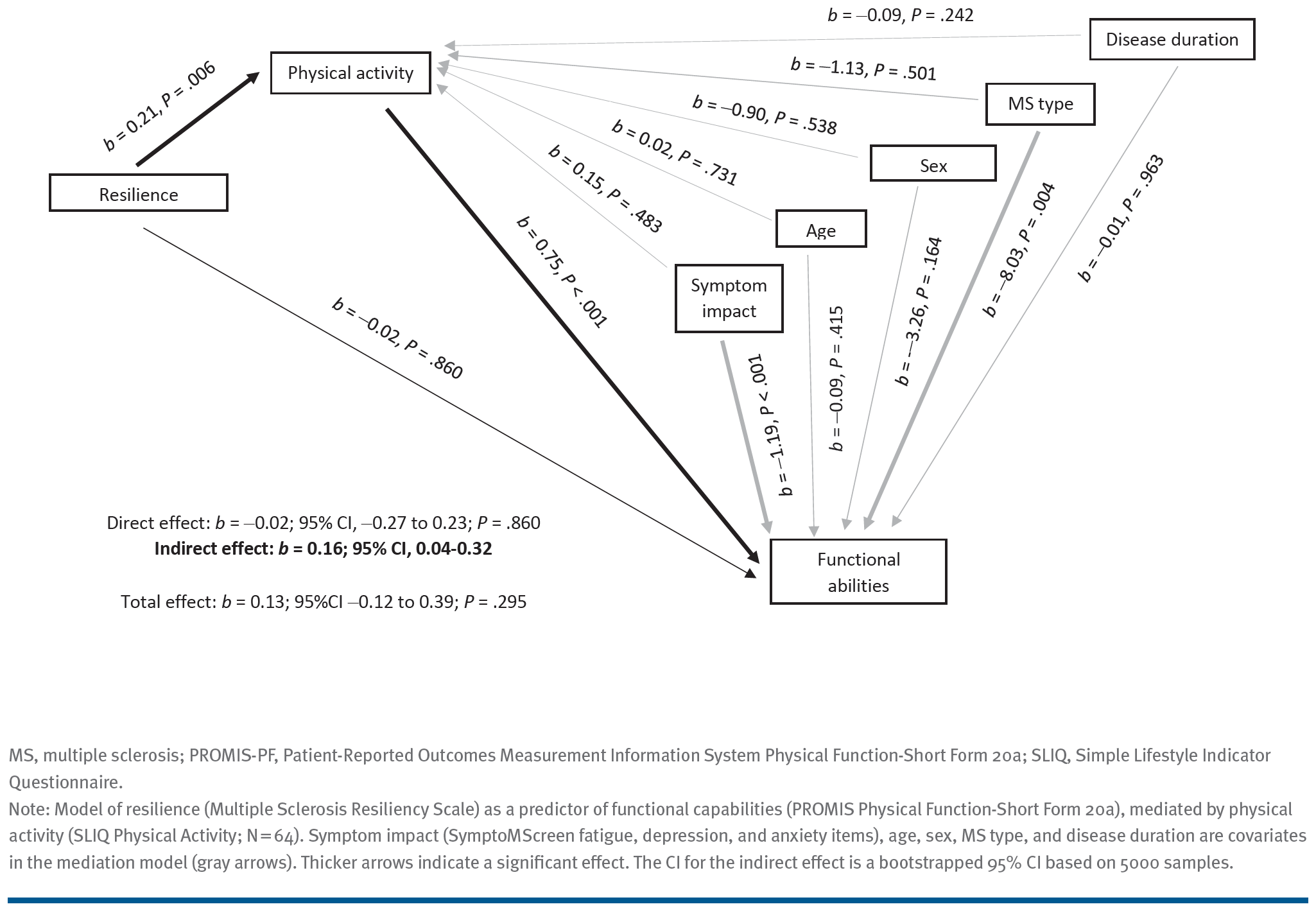 The small sample size should also be taken into consideration when interpreting the results of the mediation, as it was only powered to detect large effects with the number of included variables. As such, the finding that resilience does not have a direct effect on functional capabilities should be interpreted with caution and verified in a larger sample. While the model was theoretically based, the data were cross-sectional; thus, causal conclusions cannot be definitively made. Furthermore, it is likely that some of the relationships examined are bidirectional (eg, lower functional capabilities contributing to decreased physical activity engagement). Functional capabilities were also measured via self-report. Although self-report and performance-based functional measures are correlated,47 there is not a perfect agreement. While the depression and anxiety items of the SymptoMScreen have been validated against traditionally used scales,24 the fatigue item has not been validated against measures such as the Modified Fatigue Impact Scale. In addition, most participants were White and had a relapsing form of MS, limiting the generalizability of the results. Finally, as the SLIQ Physical Activity score was used, a closer examination of the type and level of physical activity could not be done. Future research may examine the specific types of physical activity, confirmed objectively with an accelerometer, and their relationships with resilience and functioning.