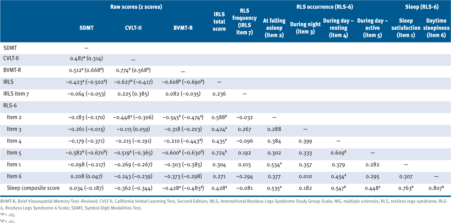 Restless legs syndrome (RLS) is a sensorimotor sleep disorder that occurs in an estimated 26% of persons with multiple sclerosis (MS),1 and it may exacerbate the symptoms and consequences of MS,2 including cognitive function. Indeed, there is evidence that sleep disorders and cognitive impairment are prominent and debilitating consequences of MS,3,4 and markers of sleep quality have been associated with cognitive impairment in MS. There is recent evidence supporting the association between the presence and severity of RLS with perceived cognitive impairment in adults with MS.5 In this recently published study, adults with MS and RLS perceived their cognitive impairment as significantly worse than adults with MS alone5; however, the relationship between RLS symptoms and neuropsychological measures of cognitive function has not been evaluated in adults with MS. This is important because there is a strong degree of uncertainty regarding the meaning of scores from measures of perceived cognitive function in MS whereby self-reported scores often correlate with psychological symptoms (ie, mood and emotion) more so than neuropsychological tests of cognitive function.6–8