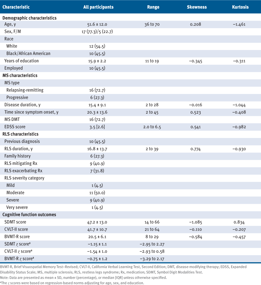 Characteristics of the 22 adults with MS and RLS in the study sample are presented in TABLE 1. The sample had a mean (SD) age of 51.6 (12.0) years and was primarily White (55%) and female (77%) with relapsing-remitting MS (73%), a mean (SD) disease duration of 15.4 (9.1) years, and moderate disability (median [interquartile range] EDSS score = 3.5 [2.6]). The sample had RLS symptoms for a mean (SD) of 16.8 (13.7) years, and only 46% of participants had received a previous diagnosis of RLS, with 27% reporting an immediate family member with RLS. Approximately 73% of individuals were receiving disease-modifying therapy for managing MS, including 41% of participants taking 1 or more medications that could improve RLS symptoms (eg, pramipexole, gabapentin, and rotigotine23) and 32% taking 1 or more medications that could worsen RLS symptoms (eg, antidepressants and first-generation antihistamines24). Regarding cognitive impairment, mean (SD) scores were 47.2 (13.0) for the SDMT, 41.7 (10.7) for the CVLT-II, and 20.5 (6.1) for the BVMT-R, and all were comparable with a recent systematic review of validation studies for the BICAMS battery.16 Scores for the BICAMS battery were slightly above the suggested cutoff scores of 44 for the SDMT, 39 for the CVLT-II, and 17 for the BVMT-R for identifying impaired cognitive performance for adults with MS.25 Mean (SD) regression-based norm-corrected z scores adjusting for age, sex, and years of education were −1.15 (1.1) for the SDMT, −1.54 (1.0) for the CVLT-II, and −0.75 (1.2) for the BVMT-R.