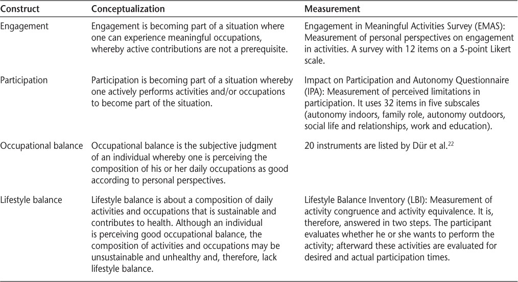 To assess occupational balance, Dür et al22 provided an overview of 20 different instruments to be used in clinical practice or research in diverse target groups. These instruments mainly assess balance in the variety of occupational patterns and areas, time use, congruence among occupations, and meaning of occupations.22