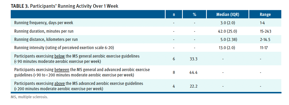 Individuals with multiple sclerosis (MS) have expressed interest in participating in running or are already engaged in running.1,2 Running or jogging demands a high level of mobility, balance, and endurance. Therefore, maintaining the ability to run can be challenging for individuals with MS due to the impairments associated with the disease, including reduced strength, balance, coordination, altered vision, heat sensitivity, and fatigue.3 As a result, MS impacts mobility and is associated with the risk of falling.4 Exercise can improve some of these impairments and can be associated with a reduction in disability.5,6 Thus, participation in sports and exercise from an early stage in the disease process may be key to maintaining the high level of mobility associated with running, although this is still an emerging area of research.7