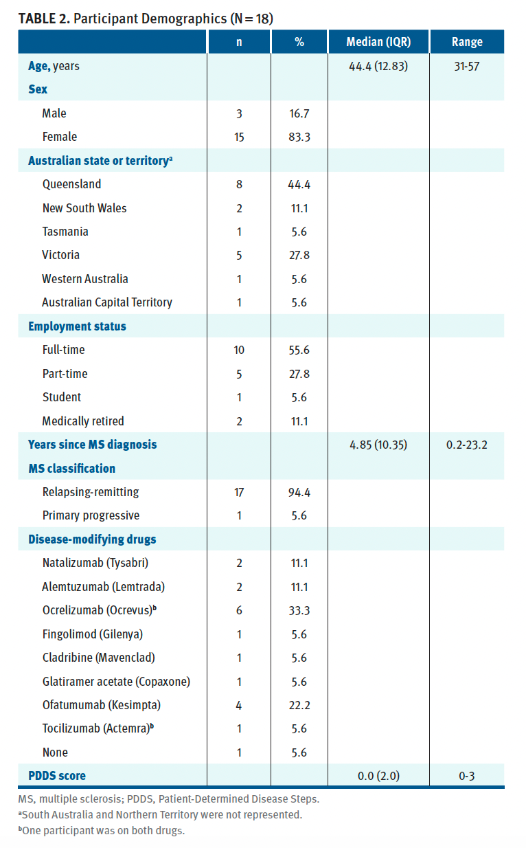 Participants were from most states and territories in Australia except for South Australia and the Northern Territory. This diverse range of locations provided an opportunity for key elements of running with MS to be explored, such as climate, safety, and accessibility. Participants were predominantly classified as having relapsing-remitting MS (94%), and PDDS scores were in the normal to moderate disability range (range, 0-3); therefore, they were not representative of individuals with secondary progressive MS or greater disability. Running may be best suited to individuals with MS who exhibit low or no disability, most likely in the early stages of the disease. Empowering individuals with MS to run could help them increase their physical activity level safely, thereby addressing symptom management and fitness.