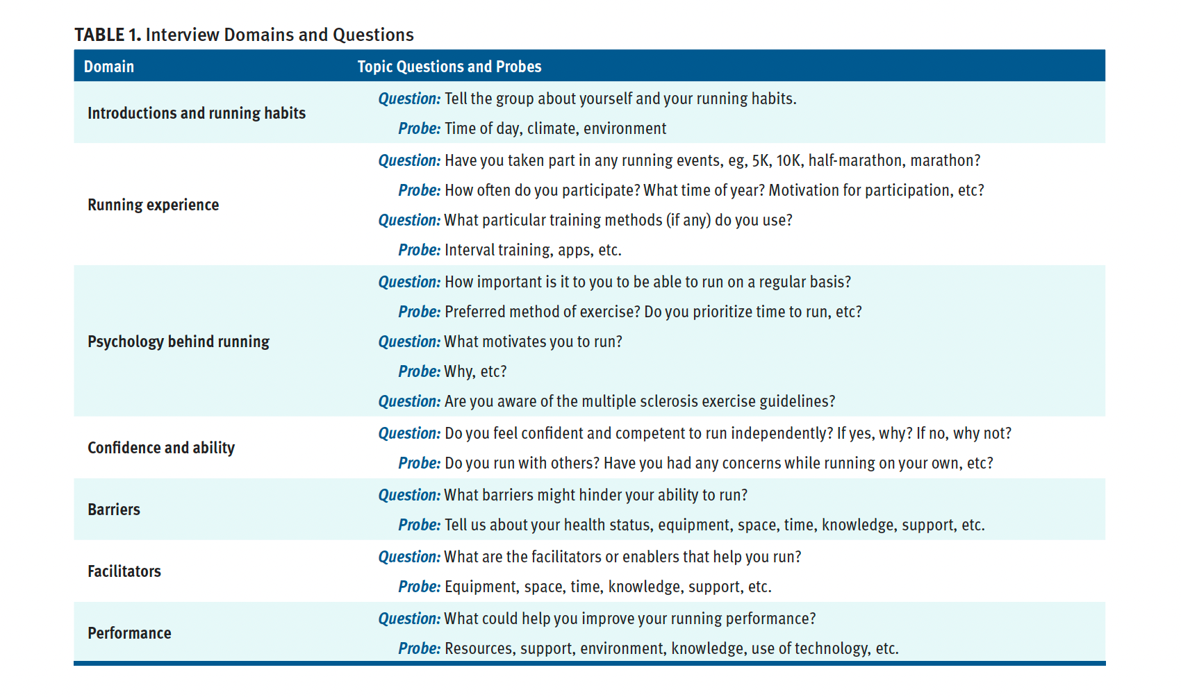 While some individuals may participate in running independently, others seek support.1 Evidence suggests that health care professionals (HCPs) do not provide enough guidance on exercise,1 and research has shown a need for more health and exercise discussions between HCPs and individuals with MS.8,9 The lack of discussion may be related to HCPs’ lack of familiarity with the guidelines regarding physical activity and exercise for individuals with MS.10-12 Key factors for general exercise participation for these individuals include: internal factors (knowledge, self-efficacy), external factors (environment) and management (support systems).13 However, specific perspectives in relation to running with MS have not yet been explored.