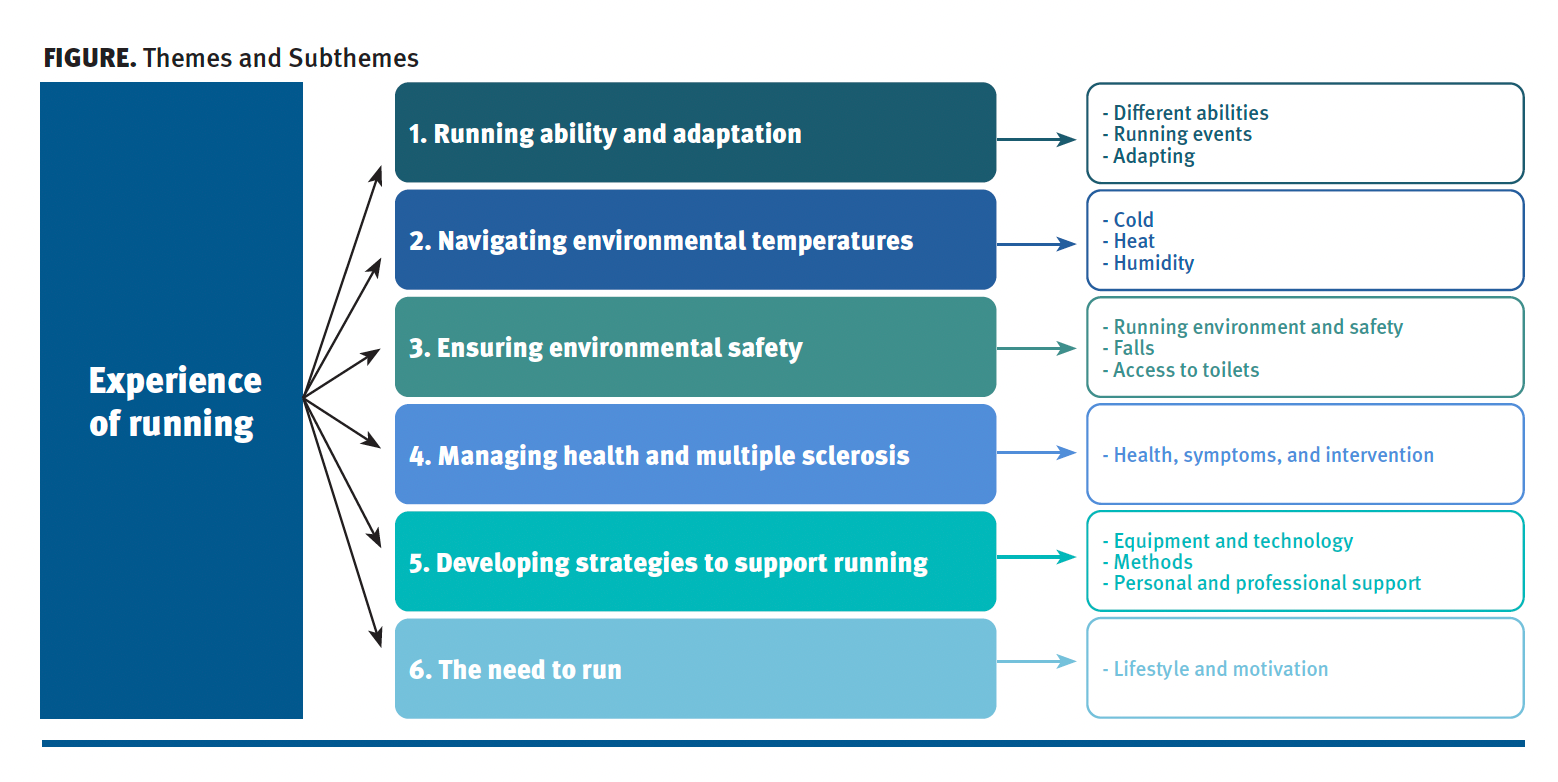 Of 25 invited individuals, 18 agreed to be interviewed. The 3 men and 15 women had a median age of 44 years (IQR 12.8; range 31-57); 56% worked full-time; 94% had a relapsing-remitting diagnosis; and the median PDDS score was 0.0 (IQR 2.0; range, 0-3). Most met or exceeded the general MS aerobic exercise guidelines,16,17 running 3 days per week (IQR, 2.0; range 1-4) for a median duration of 42 minutes per run (IQR, 25.0; range, 15-243). All participant demographics are in Table 2, and Table 3 is a running activity chart. From the interview data, 6 main themes were identified with underpinning subthemes (Figure 1).