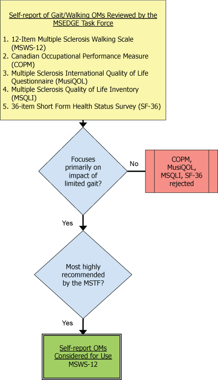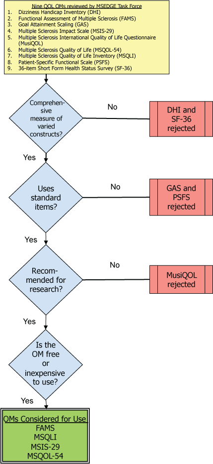 The MSTF recommendations included nine OMs that measure various aspects of QOL and were deemed appropriate for the practice setting (outpatient) and the EDSS scores of the population (generally 0–7.5). The practice manager considered the following criteria: the OM should be comprehensive and measure varied constructs, be appropriate for research for program-level review of effectiveness, and be inexpensive to use (Figure 5). Four measures of QOL met the criteria for consideration: