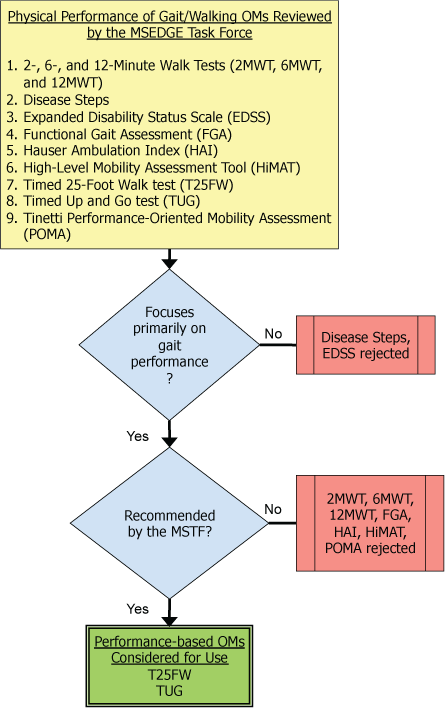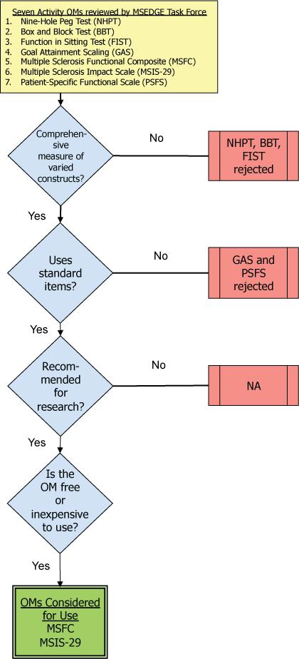 This article illustrates a clinical decision-making process by which the recommendations of the MSTF were used to select appropriate OMs for an individual person with MS and for programmatic assessment in an interdisciplinary practice for people with MS. The process narrowed OM selection to a manageable number to compare with clinician- or practice-identified criteria. From these OMs, clinicians could then choose a discrete set of the most appropriate OMs to meet their situation. The process described could be applied by clinicians in any practice setting working with people with MS at any disability level.