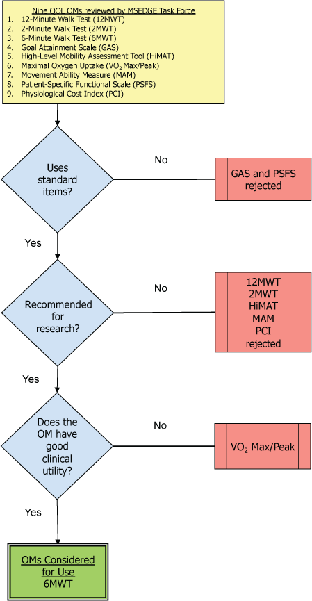 The MSTF identified nine OMs of aerobic capacity/endurance. The practice manager screened these OMs to include standardized measures of functional endurance that are appropriate for research for program-level review of effectiveness and that demonstrated good clinical utility (Figure 7).