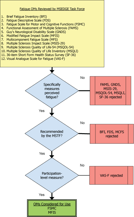 The clinician wanted a self-report measure of the impact of fatigue on Mr. G's participation in life. The MSTF reviewed 12 OMs that addressed the construct of fatigue. All 12 measures were screened for appropriateness for this case considering the following criteria: a participation-level measure specifically for fatigue that was recommended for use given the setting and the patient's level of disability (Figure 2). Two self-report OMs met the criteria:
