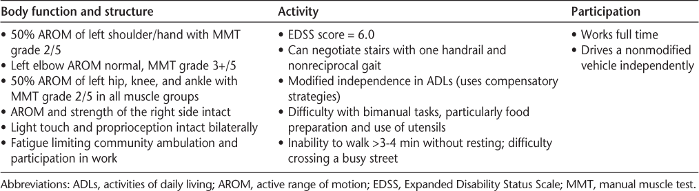 Mr. G is 43 years old, has a 10-year history of relapsing-remitting MS, and is receiving care in an outpatient setting. He recently experienced an exacerbation and has subsequently had several falls. He was previously independent in all aspects of functional mobility and was working full time as a computer programmer. His chief concerns are marked fatigue and a decline in left arm and hand function and walking ability. Mr. G's primary goal is to return to work as a computer programmer. Findings from the systems review and screening examination appear in Table 2. The clinician determined that three health-related constructs were most important for this patient: upper-extremity function, fatigue, and walking ability. The clinician investigated OMs appropriate for the setting (outpatient) and for Mr. G's Expanded Disability Status Scale14 (EDSS) score of 6.0.