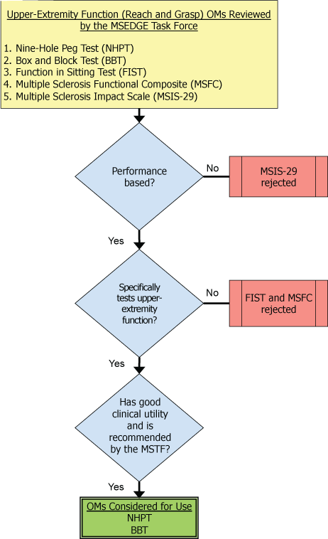 The MSTF recommendations for the NHPT and the BBT indicate that there is essentially equivalent psychometric data for these OMs in the MS population, and both require little time (<5 minutes) to administer. The NHPT was selected for two reasons. Because the patient was a computer programmer, the finer grip required for the NHPT (¼-inch pegs) was preferred to the grip required when manipulating the 1-inch cubes used for the BBT. Also, the NHPT has somewhat better clinical utility because the required equipment is less expensive than that required for the BBT.