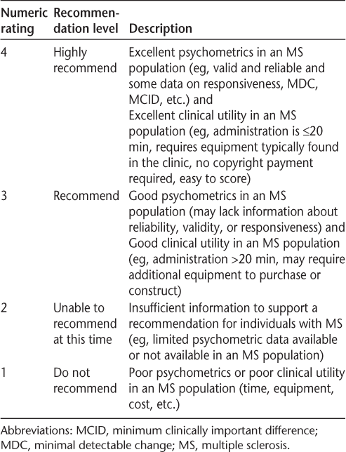 In 2010, the Neurology Section of the American Physical Therapy Association appointed the Multiple Sclerosis Outcome Measures Task Force (MSTF) to review and make evidence-based recommendations for the use of OMs in clinical practice, education, and research specific to people with MS. Sixty-three rehabilitation OMs were reviewed. An Evaluation Database to Guide Effectiveness (EDGE) form, developed by the Research Section of the American Physical Therapy Association, was modified and used by the MSTF to record each OM's properties, psychometrics, clinical utility, and recommendations. Recommendations were based on an analysis of the OM's clinical utility, a synthesis of psychometric data, and a consensus evaluation of the appropriateness of the OM for people with MS via a modified Delphi process. A 4-point rating scale, based on the strength of the OM's psychometrics and clinical utility, was used to evaluate each OM and provide recommendations for use in patients across the MS disability spectrum and in five practice settings (Table 1). These recommendations have been published previously.11