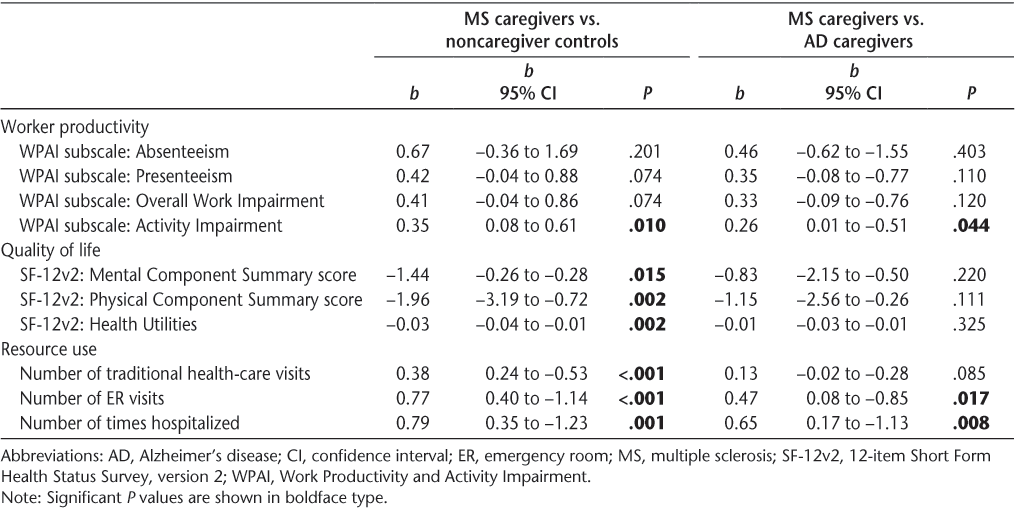 Adjusted comparisons from the multivariable regressions were consistent with the bivariate results. Adjusting for covariates, MS caregivers had greater activity impairment (P < .05), more ER visits (P < .05), and more hospitalizations (P < .01) than AD caregivers. MS caregivers and AD caregivers showed no significant differences on MCS, PCS, or health utility scores, as well as no significant differences on the other WPAI components (Table 4).