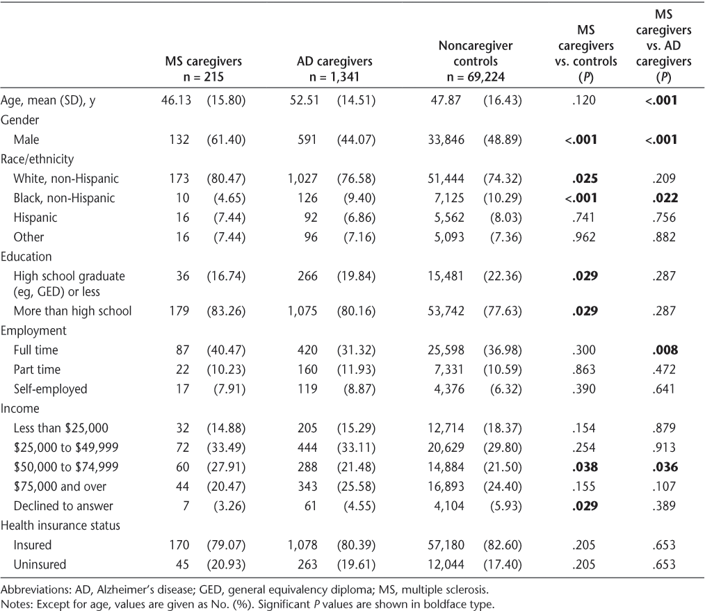 To analyze demographic, health status, and unadjusted health outcome differences between MS caregivers and noncaregiver controls and between MS and AD caregivers, bivariate analyses were performed. Chi-square tests were used with categorical variables, and independent-samples t tests were used with continuous variables.