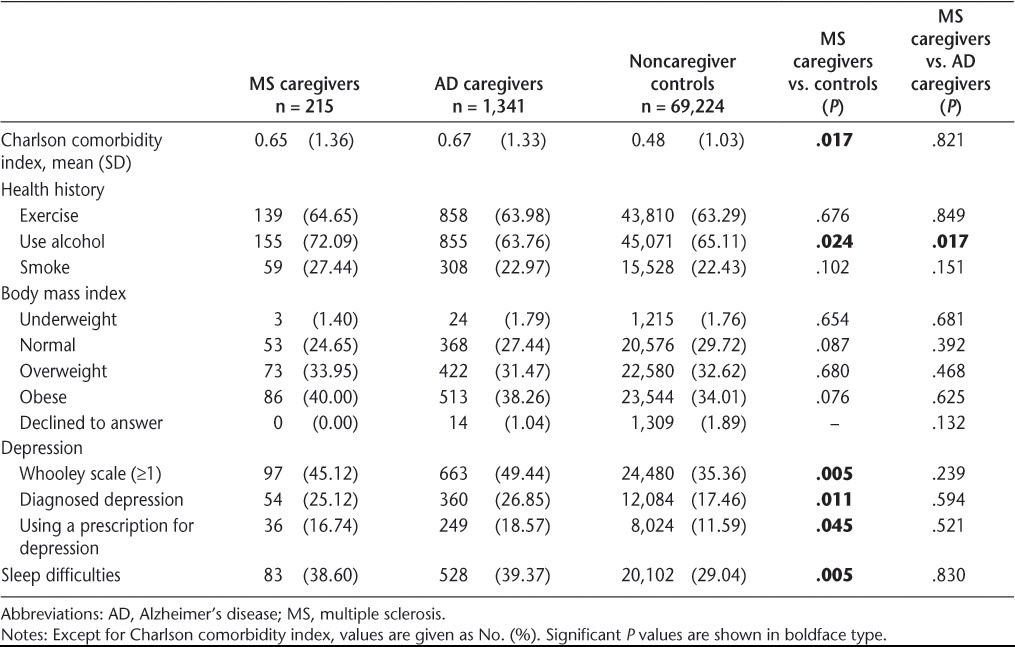 Health status information for MS caregivers, AD caregivers, and noncaregiver controls