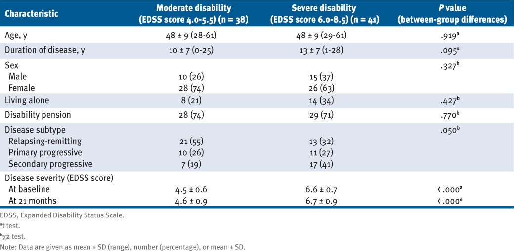 The characteristics of the participants with moderate (n = 38) and severe (n = 41) disability are presented in TABLE 1. No statistically significant between-group differences were observed in age, disease duration, sex, or proportion of those living alone or receiving a disability pension. However, there were more cases of relapsing-remitting MS in the moderately disabled group and more cases of secondary progressive MS in the severely disabled group. No within-group or between-group differences, which were measured using the t test, were found in EDSS scores during the intervention.