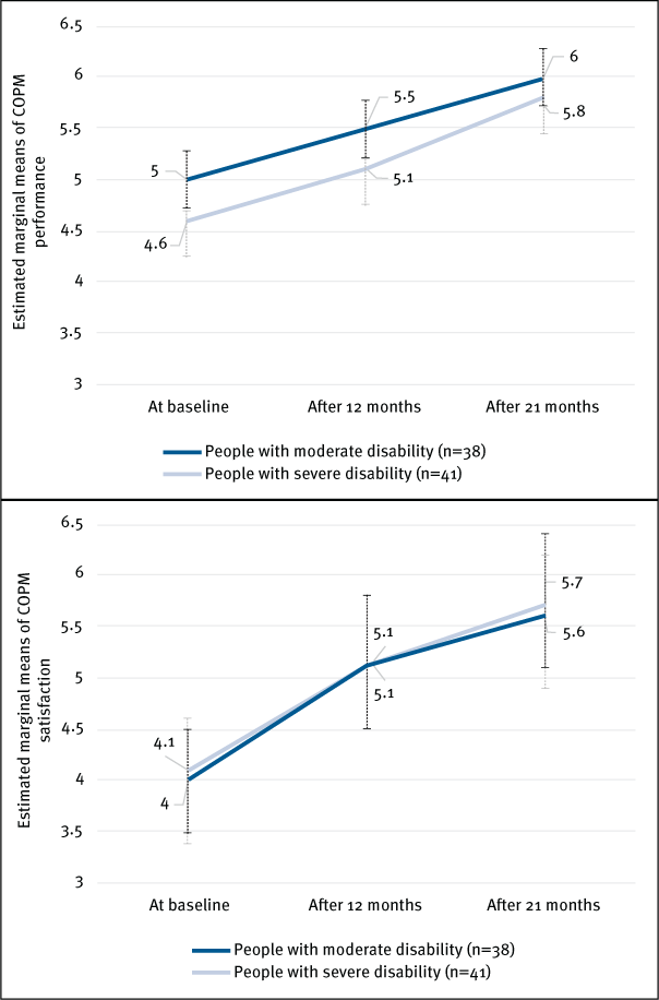 Thirty-eight adults with moderate disability (Expanded Disability Status Scale [EDSS] score of 4.0–5.5, 74% women, mean age of 48) and 41 individuals with severe disability (EDSS 6.0–8.5, 63% women, mean age of 48) were assessed at baseline and after 12 and 21 months of outpatient rehabilitation using the Canadian Occupational Performance Measure (COPM). Group × time interactions were analyzed using mixed analysis of variance. Participants’ explanations of reasons for changes in activity performance were collected via semistructured interviews and analyzed content.