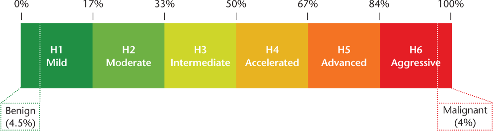 Herbert divided patients with MS into six approximately equipopulated tiers of disability based on their MSSS (Figure 2). Patients with an MSSS less than 1.7 (ie, the least disabled sextile) would be classified as having mild MS; patients with an MSSS of 1.7 to less than 3.4, moderate MS; patients with an MSSS of 3.4 to less than 5.0, intermediate MS; MSSS of 5.0 to less than 6.7, accelerated MS; MSSS of 6.7 to less than 8.3, advanced MS; and the most disabled sextile, MSSS greater than 8.3, aggressive MS. For simplicity, we label these as grades H1 to H6. In addition, Herbert suggested a rigorous MSSS-based definition for the two well-entrenched but variably defined terms benign and malignant MS, with benign defined as an MSSS less than 0.45 and malignant as greater than 9.6 (Figure 2).13 14