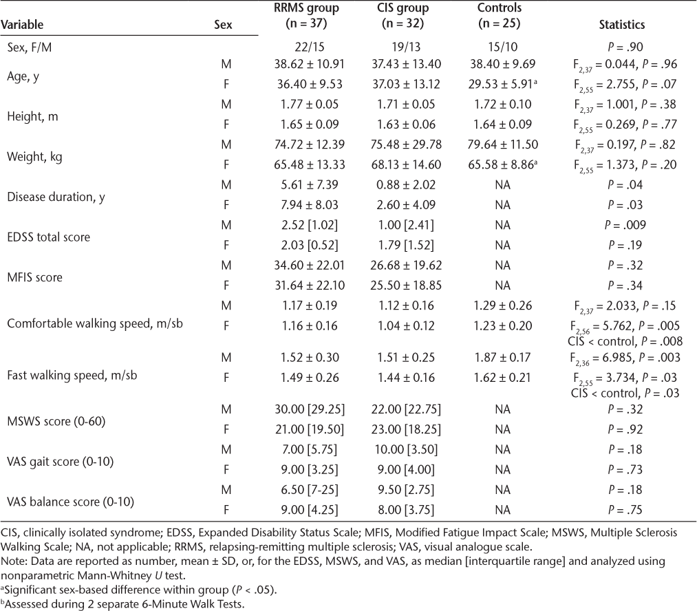 The results of the quantitative assessment of temporospatial parameters of gait are presented in Table S1, which is published in the online version of this article at ijmsc.org. Groups were comparable for gait velocity and cadence. Two-way ANOVA (sex, MS course) detected a trend toward significance for sex (F 1,63 = 3.908, P = .053) and MS course (F 1,63 = 2.838, P = .097). Although the sex × MS course interaction proved nonsignificant (F 1,63 = 1.990, P = .164), Bonferroni-corrected pairwise comparisons revealed that in the RRMS group only, men walked with a significantly wider base of support than women (+35.4%, P = .04), at a large effect size.