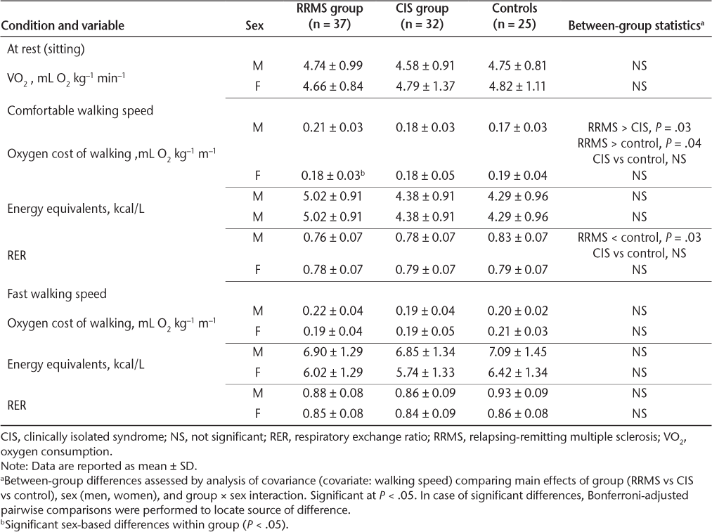 The present study was aimed at comparing metabolic rates (oxygen cost of walking, energy equivalents, and RER) during comfortable and fast overground walking in minimally disabled individuals with relapsing-remitting MS (RRMS), in those defined as having clinically isolated syndrome (CIS), and in a group of matched controls. Based on the previously described background, we hypothesized that (1) significant differences would emerge among the groups in the metabolic rates of walking, (2) sex-based differences in these outcomes would be observed, (3) the selected measures would differentiate not only individuals with MS from controls but also between the 2 MS subgroups, and (4) metabolic demands would be associated with the gait pattern.