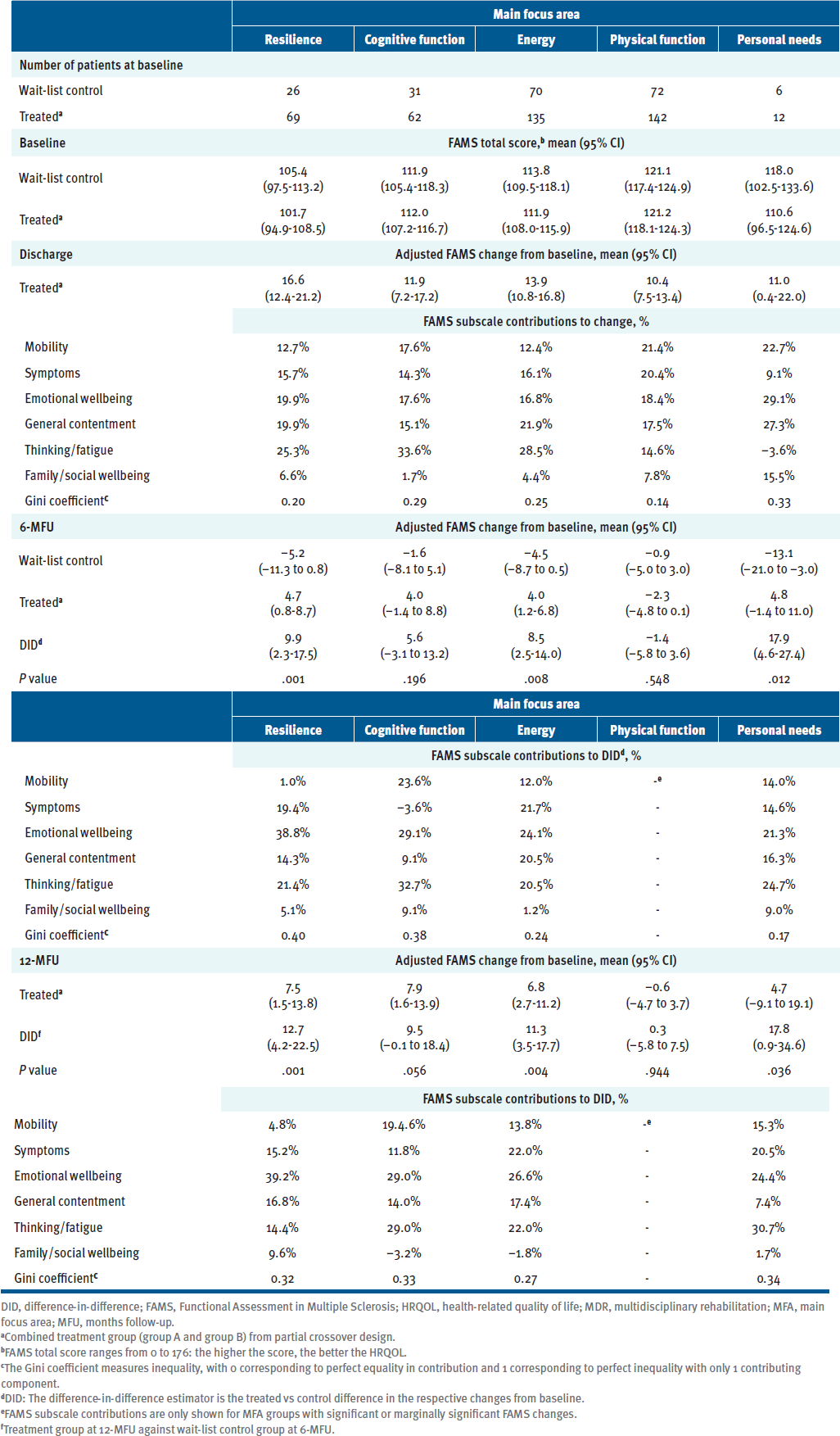 Our study has several limitations.8,9 First, the nonrandom allocation of patients to MDR treatment regimens does not allow a thorough evaluation of the relative roles of the specific treatments received and the characteristics of the specific patient population within each MFA group. However, the clinically relevant treatment differences found between wait-list control and MDR intervention groups within each of the MFA groups signifies that the received MDR content indeed was part of the mechanism of action that drove the reported differences in outcomes. Future MDR research should focus on the relative roles of symptoms, needs, MDR goals, and MDR regimens. Second, the a priori discretization of patient-centered needs and rehabilitation goals into the 5 MFAs—although guided by a screening study18—should be viewed as a methodological choice to address the differential effectiveness of MDR. A different categorization would likely have resulted in different numerical estimates, although probably similar qualitative findings. Furthermore, it should be noted that patients categorized into the same MFA—although sharing similar or related goals—do indeed have distinct personal needs and goals. We emphasize that, despite the significant differences between MFA groups, all of them had a considerable overlap in their characteristics at baseline (intraclass correlation coefficient of 0.13; Appendix S1). Third, we cannot rule out that at least some of the between-MFA differences found in effectiveness are attributable to differences in baseline characteristics among the 5 MFA groups according to the regression-to-the-mean phenomenon32 or differences in FAMS subscale sensitivity to detect HRQOL changes. However, the large within- vs between-MFA variance ratio of the baseline characteristics indicates that the regression-to-the-mean phenomenon is unlikely to explain most of the MFA differences. Lack of FAMS subscale sensitivity is unlikely to explain our findings, as large treatment effects were detected at discharge in all MFA groups. However, we cannot eliminate undetected HRQOL dimensions. Fourth, due to ethical reasons, the current study used a pragmatic partial crossover design to provide an attractive research program for patients, thereby potentially yielding biased controlled 12-MFU estimates. However, due to the progressive nature of MS, it is unlikely that patients would experience significant HRQOL improvements in the wait-list control group, thereby rendering the bias, if it exists, to be conservative.
