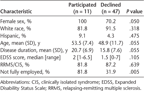 When we compared patients who enrolled in the study and those who declined to participate, we found that study participants were more likely to be female and less likely to be employed full-time. We also identified several barriers that prevented more patients from participating in the intervention, including the group being held at an inconvenient time, living too far from the MS center, and relying on others for transportation. For patients who were employed, taking time off during the middle of the day was a barrier, and for others, the inability to commit to 5 consecutive weeks of participation was a factor. It is interesting to note that of the 58 patients we approached about participation, 53 expressed an interest in the intervention regardless of whether they were able to commit to participating in the study.