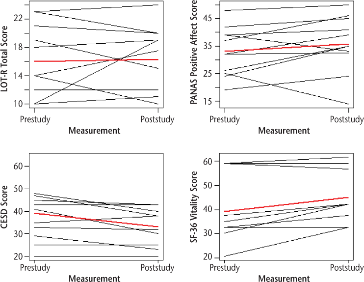 In terms of the impact of the group intervention on patient-reported outcome (PRO) measures, the summary statistics for each PRO are provided in Table 2 and Figure 2. We observed a significant increase in SF-36 vitality subscale score (P = .016) and a significant decrease in CESD score (P = .049). Changes in positive affect and SF-36 mental health subscale scores were in the right direction but did not reach statistical significance. There were no statistically significant changes in negative affect, optimism, anxiety, mental or physical HRQOL, or cognition.