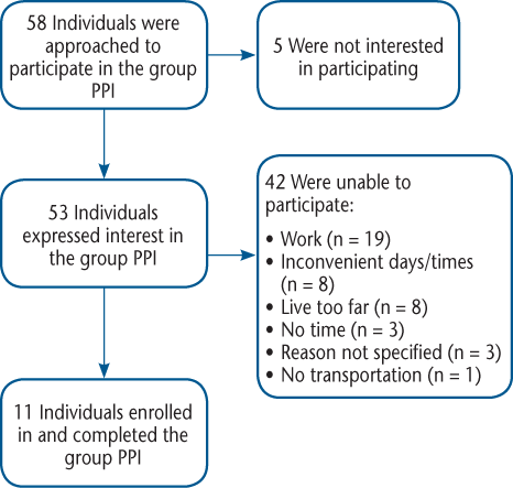 Fifty-eight patients were approached about participating, and 53 (91%; 95% CI, 81%–97%) expressed interest in the intervention. Eleven of the 58 patients approached (19%; 95% CI, 10%–31%) were enrolled in the study. The demographic and clinical characteristics of study participants and those who declined participation are provided in Table 1, and reasons for nonenrollment are summarized in Figure 1. Study participants were more likely to be female, older, and with longer disease duration. In addition, the participants were significantly less likely to be fully employed (P = .005). All the study participants completed the group intervention (100%; 95% CI, 72%–100%). Five of the 11 patients (45%; 95% CI, 17%–77%) attended all five sessions, four (36%) attended four sessions, and two (18%) attended three sessions.