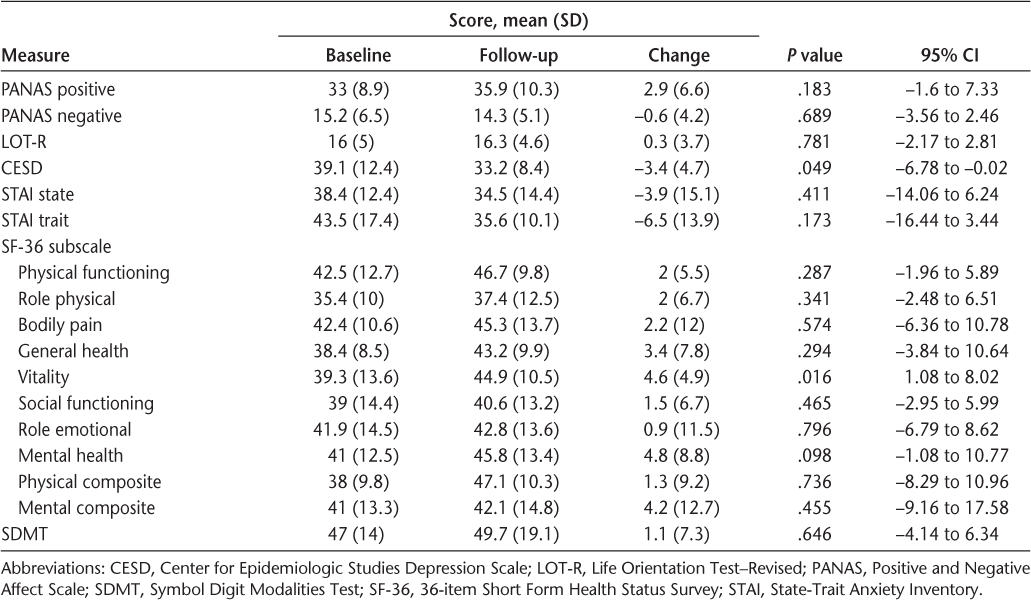 This preliminary study has several limitations. First, because the study did not include a control or comparison arm, it is unclear whether the PRO changes would have been observed in the absence of the intervention. It is possible that participation in the group process or engagement with the facilitator were related to the findings. Second, patients may have demonstrated improvement on self-rated measures to justify their participation in the study or to please the researchers.25 Third, all the participants were female, and it is unclear whether the group intervention would be similarly acceptable to male patients. The willingness of males with MS to participate in group psychosocial interventions should be assessed more closely to ensure that their needs are being addressed. Fourth, although all the participants completed the study, demonstrating the feasibility and acceptability of the intervention, there was a high decline-to-participate rate. This suggests that an intervention requiring weekly visits to an MS center may not be feasible for a large segment of the MS population. Alternative approaches to delivering the intervention should be considered, including the development of a virtual group positive psychology intervention that uses web conferencing and would allow patients to participate from home. Finally, given the small sample size, the study was not powered to detect statistically significant changes in several of the PRO measures. A follow-up study with larger numbers of participants and a control arm is required to estimate the impact of this intervention.
