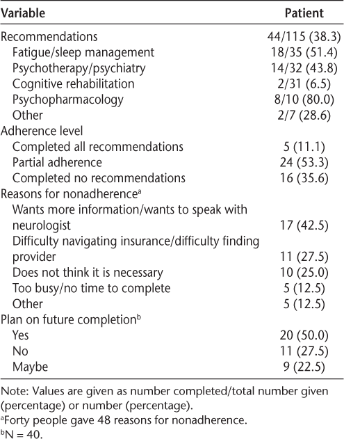 Patients were given one to four recommendations, with most (n = 24 [53%]) receiving three. Overall, this sample of 45 patients with MS received 115 recommendations, of which 44 were reportedly completed, yielding a 38.3% overall adherence rate. Five patients completed all the recommendations (11.1% total adherence), 24 completed some (53.3% partial adherence), and 16 completed none (35.6% nonadherence). Of the 40 patients with no or partial adherence, 20 (50.0%) reported that they planned to complete the recommendations and 9 (22.5%) reported that they might.