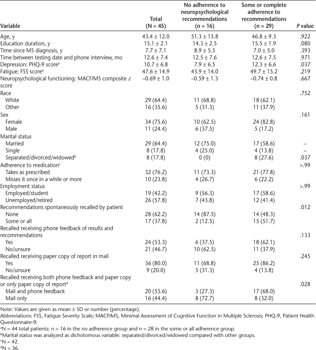 Of the 66 patients seen during 2015 and 2016, eight received no specific recommendations after neuropsychological testing, one did not have MS, one had noninterpretable results, and one was included in another study, making her ineligible; thus, 55 patients were eligible and were contacted by phone. A total of 45 patients with MS (mean [SD] age, 43.4 [12.0] years) were reached and included in this study (Table 1). Women made up 75.6% of the sample, consistent with the higher prevalence of women in the MS population.25 The mean MACFIMS composite score was within the reference range (no significant differences between groups; P = .667). For the 42 patients who reported regular medication/DMT use, 76.2% reported taking their medication as prescribed, while 23.8% reported that they missed their medication “once in a while” or “often.” Table 2 further describes patient characteristics and descriptive statistics.