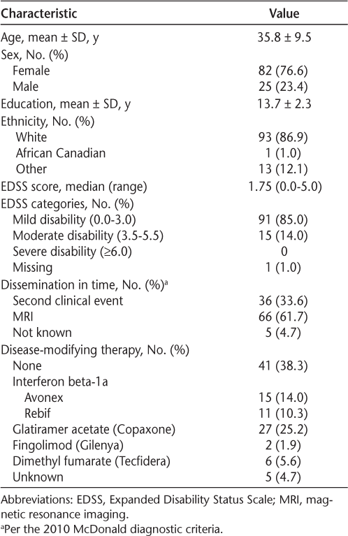 A baseline assessment was performed in 107 newly diagnosed persons with MS; demographic characteristics are presented in Table 1. The mean ± SD age of the cohort was 35.8 ± 9.5 (range, 16–58) years, and 82 participants were female (76.6%). In terms of the MS characteristics, the median Expanded Disability Status Scale score was 1.75 (range, 0.0–5.0), and only 36 participants (33.6%) were diagnosed as having MS based on a second clinical event. As expected in a newly diagnosed cohort, just more than half had started disease-modifying therapy at the time of assessment (n = 66 [61.7%]).