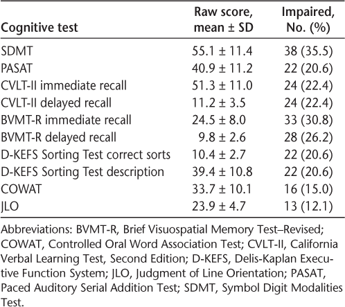 The cohort was predominantly female (n = 82 [76.6%]) and white (n = 93 [86.9%]). Only 36 patients (33.6%) were diagnosed as having RRMS based on a second clinical event. Processing speed was the most frequently impaired domain (n = 38 [35.5%]). Only 37 patients (34.6%) were within normal limits on all cognitive domains. Regarding mood symptoms, 25 patients (23.4%) were positive for depressive symptoms; 59 (55.1%), for anxiety. Severe fatigue was correlated with a lower score on the Symbol Digit Modalities Test (SDMT) (r = −0.380, P < .001), and higher depressive scores were correlated with lower performance on the SDMT (r = −0.397, P < .001) and the Paced Auditory Serial Addition Test (r = −0.254, P = .009).