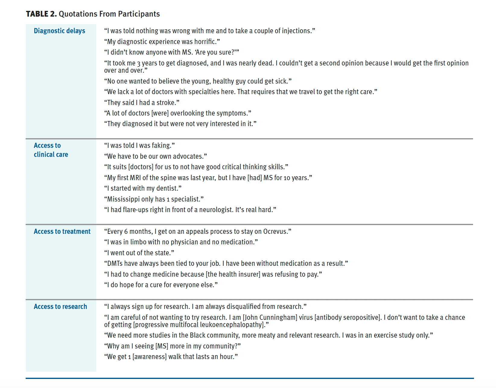 Six participants believed that race was relevant to a delay in diagnosis and, at times, a misdiagnosis of MS. This mostly applied to Black participants. One said, “I was told, ‘It’s going to be a while to get you in.’ Me being a woman. Me being a Black had something to do with it.” Another added, “I had to make myself look bigger and stronger and louder to get what I need[ed].” Several participants expanded their experiences to their perceptions of Black individuals in the health care setting in general. “How many other Black people are told they are faking instead of sending them to a doctor who can figure it out?” They also emphasized historical injustices in the US, including, “As the Black community, we have been taught for years to keep our mouths shut” and “We were told for years to keep our mouths closed…taught not to tell our business.” Awareness in the African American/Black community was thought to be in need of strengthening overall, as stated by 2 participants: “I think a lot of African Americans don’t know about MS. I don’t think they realize the inflictions” and “I think people should be more informed in the Black community about MS. Before I had it, I didn’t know anything about it.”
