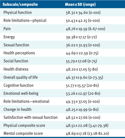 QOL is a comprehensive concept consisting of physical, social, psychological, and functional aspects.14 Many tools are used to measure QOL, but, due to its multidimensional and hybrid nature, the Multiple Sclerosis Quality of Life-54 (MSQOL-54) questionnaire is one of the instruments most commonly used to measure MS-specific QOL.15,16 MS-specific instruments provide more comprehensive and accurate assessment of the impact MS has on health and QOL than generic instruments.17,18