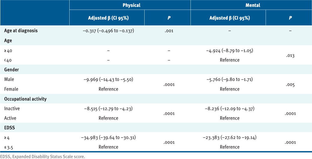 Final models were established after performing a manual multiple linear regression analysis, carefully integrating relevant sociodemographic and clinical factors. Results indicated that the factors negatively associated with PH and MH were: male gender (PH: β = −9.969; 95% CI, −14.43 to −5.50/MH: β= −5.760; 95% CI, −9.80 to −1.71), unemployment (PH: β = −8.515; 95% CI, −12.79 to −4.23/MH: β= −8.236; 95% CI, −12.09 to −4.37), and as high EDSS scores (PH: β = −34.983; 95% CI, −39.64 to −30.31/MH: β = −23.383;95% CI, −27.62 to −19.14). Moreover, advanced age was associated with low MH (β = −4.924; 95% CI, −8.79 to −1.05), whereas late age at diagnosis contributed to worsened PH (β = −0.317; 95% CI, −0.496 to −0.137). EDSS score was found to be the strongest predictor of QOL for people with MS in our study (TABLE S2).