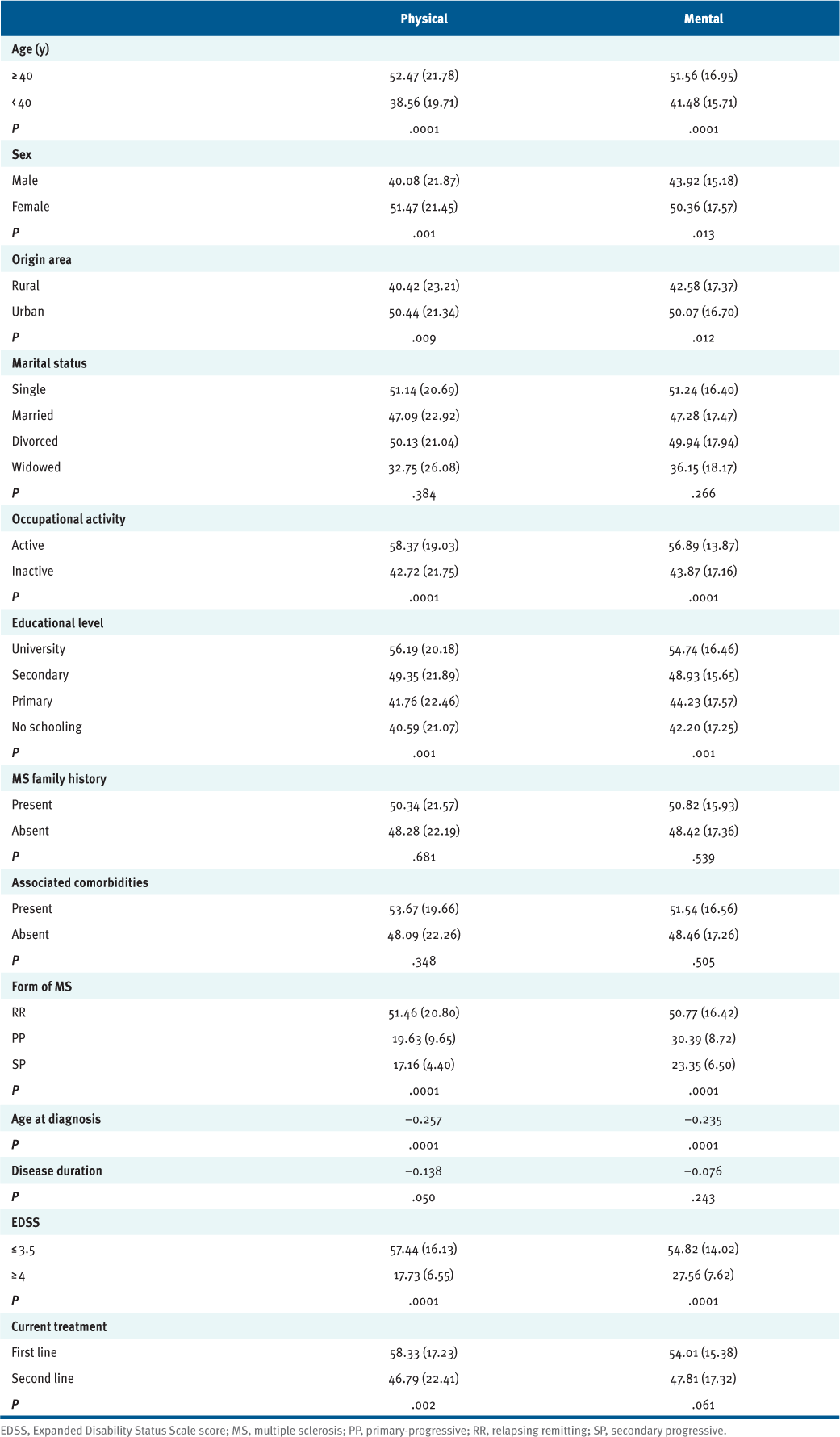 After univariate analysis, several factors influence both PH and MH. People living in urban areas had significantly higher PH and MH scores than those living in rural areas, which is supported by previous studies.41,53,54 This may be due to their greater access to specialists and other therapies. As a result, they are more likely to receive the assistance they need to overcome difficulties.48,55 In addition, higher levels of education were significantly associated with better PH and MH. More educated people with MS experience greater confidence and an enhanced ability to initiate treatment early, contributing to more effective management and strong adaptation to the physical and mental challenges involved.7,48 A higher level of education therefore acts as a protective factor against QOL deterioration, as it promotes a better understanding of the disease.33,34,56 Some studies indicate that patients with RRMS have better PH and MH scores.13,21,34 However, other studies have indicated that the type of MS has no bearing on QOL.48,50 One possible explanation is that the disease develops more rapidly in patients with progressive MS, leading to severe symptoms that may have a negative impact on QOL.14,31,57
