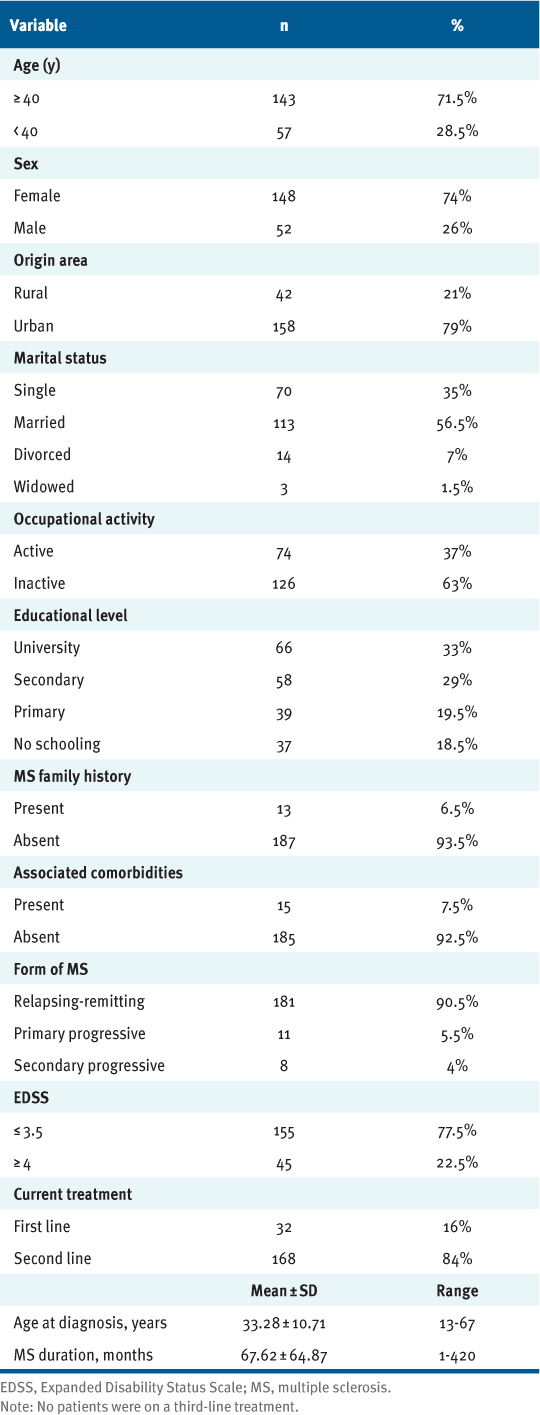 This cross-sectional study was conducted over a 6-month period from October 2022 to April 2023. Recruited patients were followed by the neurology department of the University Medical Hospital Hassan II in Fez, Morocco, and were contacted either during their outpatient hospitalization or in consultation. Via consecutive sampling, we included a total of 200 patients who fulfilled the following inclusion criteria: (1) aged 18 years or older, (2) confirmed diagnosis of MS based on the revised McDonald criteria (2011),24 (3) an Expanded Disability Status Scale (EDSS)25 score between 0 and 8, and (4) no exacerbations recorded in at least the previous 4 weeks. Exclusion criteria included patients with a questionable diagnosis of MS, with pronounced cognitive and psychiatric disorders, and with concomitant diseases likely to interfere with QOL.