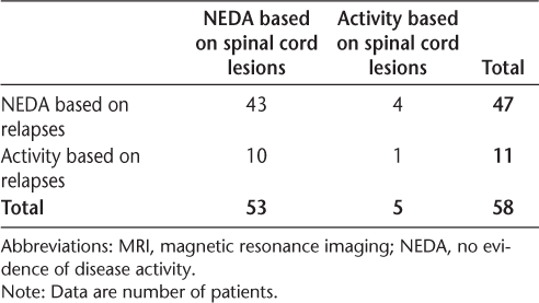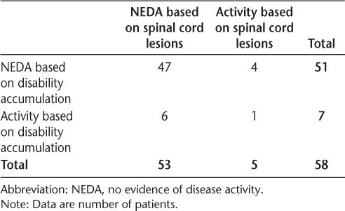 Comparisons of patients achieving NEDA based on spinal cord lesions and relapses are shown in Table 3. Comparisons of patients meeting the definition of NEDA based on spinal cord lesions and accumulation of physical disability (EDSS score) are shown in Table 4. Based on the 58 patients with clinical information, 81.0% (n = 47; 95% CI, 68.6%–90.1%) maintained NEDA in terms of relapses and 87.9% (n = 51; 95% CI, 76.7%–95.0%) maintained NEDA based on disability accumulation. In this slightly reduced sample, 91.4% of patients (n = 53; 95% CI, 81.0%–97.1%) maintained NEDA on spinal cord imaging. Forty-three patients maintained NEDA on both spinal cord imaging and relapses. Interestingly, 80% of the patients who had spinal cord activity at follow-up did not have an accompanying relapse. Four of 47 patients (8.5%; 95% CI, 2.4%–20.4%) who had NEDA based on relapses were identified as having disease activity on spinal cord MRI. When assessing patients who maintained NEDA on both spinal cord imaging and disability accumulation, 47 maintained NEDA on both measures, and only 1 patient had disease activity on both measures. Four of 51 patients (7.8%; 95% CI, 2.2%–18.9%) who achieved NEDA based on disability accumulation were identified as having disease activity in the spinal cord.