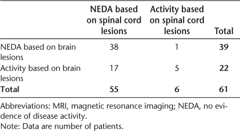 The proportions of patients who achieved NEDA in terms of lesion accumulation on brain MRI, lesion accumulation on spinal cord MRI, EDSS score progression, and relapse were estimated, and 95% confidence intervals (CIs) for each proportion were estimated using the exact binomial distribution. For the identification of disease activity using brain versus spinal cord lesions, the paired measurements were compared using the McNemar test. Furthermore, to estimate the additional diagnostic value of including spinal cord imaging, the proportion of patients who achieved NEDA in terms of lesion accumulation on brain MRI, EDSS score progression, or relapse but had disease activity on the spinal cord was calculated.