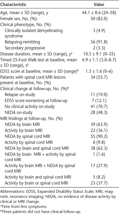 We prospectively studied 61 consecutive patients with MS from the Partners Multiple Sclerosis Center at Brigham and Women's Hospital (Boston, MA) who underwent MRI at baseline and 1 year later. Patient demographic and clinical data are summarized in Table 1. All the patients meet the International Panel criteria for either MS or a clinically isolated demyelinating syndrome.26 Progression of Expanded Disability Status Scale (EDSS) score27 was defined as an increase of 1.0 point or more at 6-month follow-up, which was required to be sustained at a clinic visit 6 months later (with the exception that if the EDSS score was 0 at baseline, a 1.5-point increase was required). At each clinic visit, patients had an evaluation of EDSS scores and anteceding relapses. During the observation period, 56 patients (91.8%) were already receiving DMT (monotherapy with intramuscular interferon beta [IFNβ]-1a [n = 20], subcutaneous IFNβ-1a [n = 11], IFNβ-1b [n = 1], glatiramer acetate [n = 20], natalizumab [n = 2], or mycophenolate mofetil [n = 1] or dual therapy with IFNβ-1a and mycophenolate mofetil [n = 1]). Of the 56 patients receiving DMT, 48 (85.7%) were receiving treatment for a mean ± SD of 4.8 ± 4.4 years (range, 0.1–14.1 years) at study entry. The other eight patients were newly started on DMT at the time of baseline MRI. There were three patients who had imaging at follow-up but were lost to clinical follow-up. All the patients signed an informed consent form; this study was approved by the Brigham and Women's Hospital research ethics committee.