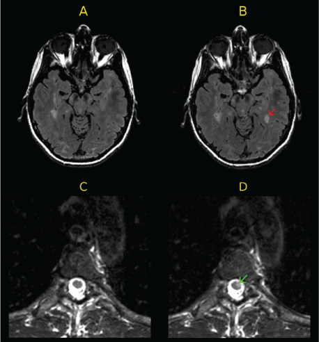 An experienced observer (ST) analyzed baseline and follow-up images concurrently using Jim software, version 7 (Xinapse Systems, West Bergholt, UK). Uncertain cases were reviewed by a senior observer (RB). Image window width and level were adjusted by the observer to ensure a consistent comparison between the two time points. The follow-up images were categorized qualitatively as active by the presence of either new or enlarging T2 hyperintense lesions. Thus, achieving NEDA by MRI was defined as no new or enlarging T2 hyperintense lesions. Examples of disease activity in the brain and spinal cord are shown in Figure 1.