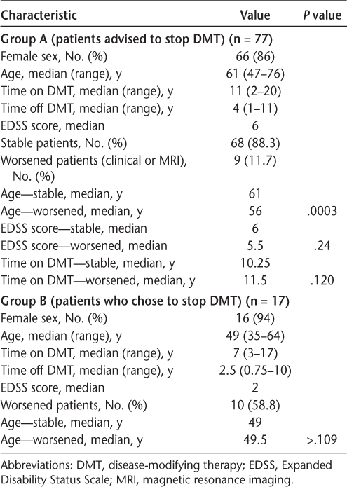 Data were entered into a spreadsheet program (Microsoft Excel; Microsoft Corp, Redmond, WA). Statistical analyses were performed by Dr. Gary Cutter (professor of biostatistics, University of Alabama, School of Public Health, Birmingham, AL) using the statistical software of the application. Differences between and within groups were calculated using the Wilcoxon two-sample test, the NPAR1WAY procedure (analysis of variance), and the Kruskal-Wallis test. Variables compared were age at time of change of DMT, time on DMT, time off DMT, Expanded Disability Status Scale (EDSS) scores of stable and worsened patients, and ages of stable versus worsened patients. Variations in DMTs used were not studied owing to their great variability, but none of the patients were receiving oral or intravenous DMTs.