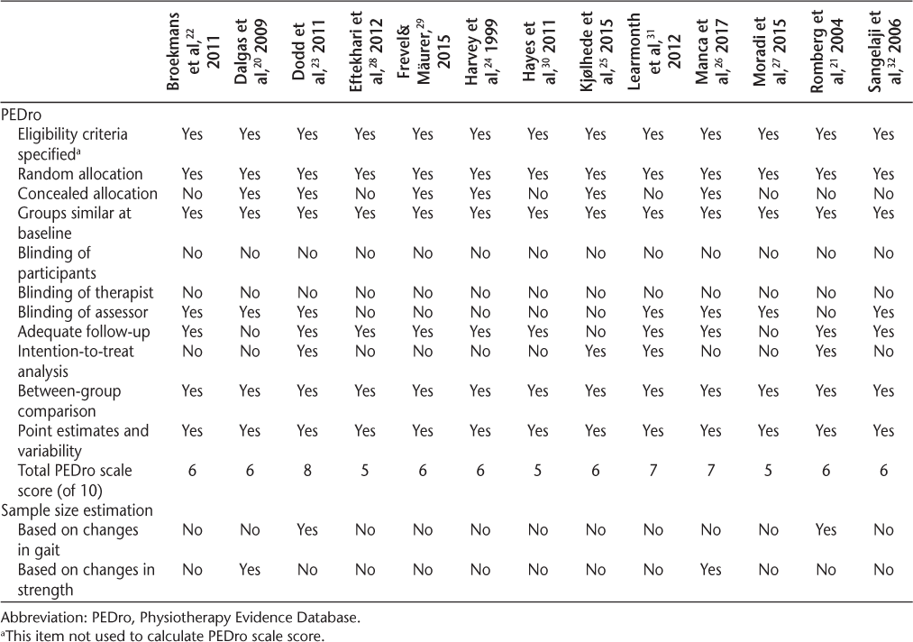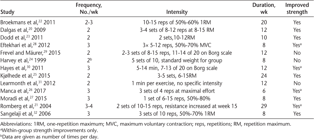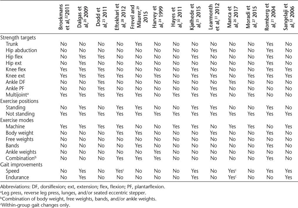 Critical reviews often synthesize diverse sources of evidence rather than answering a clinical question, and this review included a heterogeneous group of studies, many of which included other interventions besides strength training. Importantly, some studies did not include strengthening as a primary intervention and were not powered to detect changes in strength or gait. Owing to this heterogeneity, a meta-analysis was not performed, and this is a limitation of this review. In addition, the inclusion of other interventions in addition to strength training also could have influenced results of individual trials, and improvements in those trials cannot be directly attributed solely to strength gains.